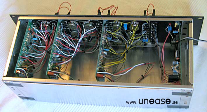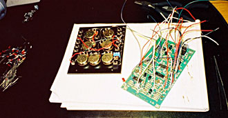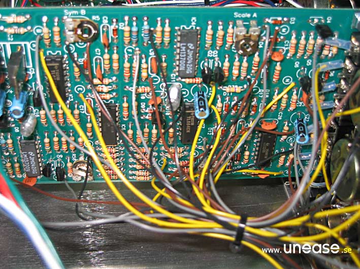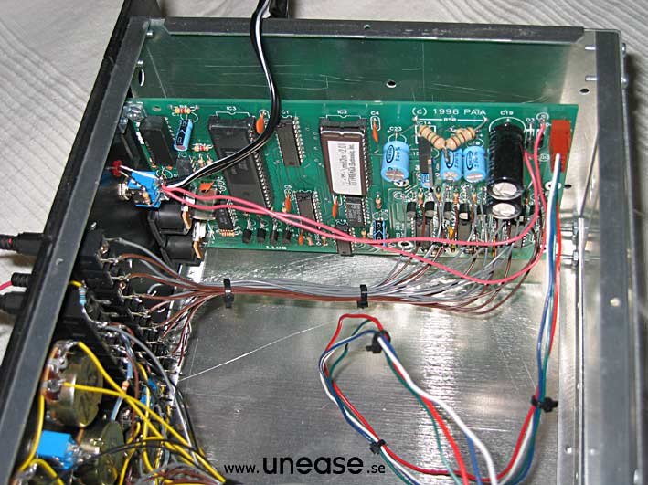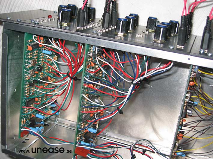 PAiA 9700S (DIY, step-by-step by Tommy) The P9700S is delivered as four separate kits, one for each module: MIDI-CV converter, VCOs, VCFs and the VCA. The circuit boards are not pre-populated, all the resistors and capacitors have to be soldered by hand. However soldering the parts to the board is pretty easy. The most tedious work is to solder the flying wires, the wires connecting the circuit board to the pots, jacks and switches on the panels. The jacks are a bit sensitive to heat and holding the soldering iron to long against it may cause the jack’s plastic cover to melt. It took me approximately one working week (40h) to complete the whole kit. It can probably be done faster by someone more experienced than me, but taking the time to get everything right from the start is key to get a working synth in the end. Interchanging two components may cause severe damage to the module when first powering it up. The documentation is very helpful and makes it easy to do the job methodically. The Paia 9700S does not make use of any pre-manufactured synth chips like CEM or SSM in the audio chain. The only integrated circuits are the OpAmps and comparators etc, except for the MIDI-CV converter, which of course have some digital components. The quality of the pots is excellent with steel shafts and smooth operation. The 1/8'' jacks are small and a bit flimsier than 1/4'' ones, but they make the synth more compact. The patch cables delivered with the kit showed to be more or less unusable. The plugs fit very badly in the jacks which makes it hard to pull them out after inserting them. Often the plastic covers of the plug comes off when trying! The P9700S must be one of the most compact modular synths there is with lots of functions that may not be evident at a first look; especially the VCA/Mixer which houses a loopable ADSR, a stereo mixer with panorama, ringmodulator and a noise source. There are a lot of helpful normalizations that keeps the number of needed patch cables low. For example, the ADSR is by default connected so it affects the signal passed to the input of the mixer. By connecting something else to the output of the ADSR, the normalization is overridden. The sound could be described as very vintage, full bodied, and animated. For example when modulating the pulse width with one of the AD-modulators in cycle mode the modulation is not a clean sine wave which results in interesting variations in the sound. The filters are a bit peculiar. High resonance sounds are not its strength in my opinion, being a bit uncontrollable at times (listen to demo Bass1). But having two multimode filters does allow for a lot of possibilities together with the stereo mixer section. The Paia is cheap compared to a corresponding system from say Doepfer or Analogue Systems but you have to like the idea of building it your self. If you’re not interesting in the building part, don’t buy it just because it is cheaper. See the finished instrument here.